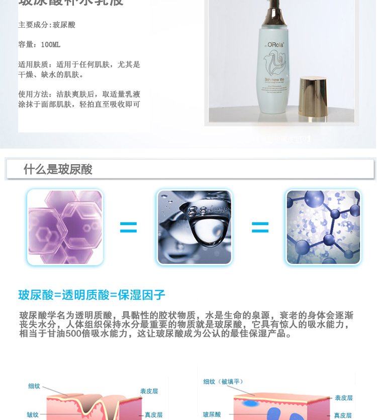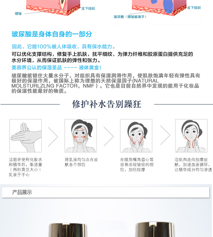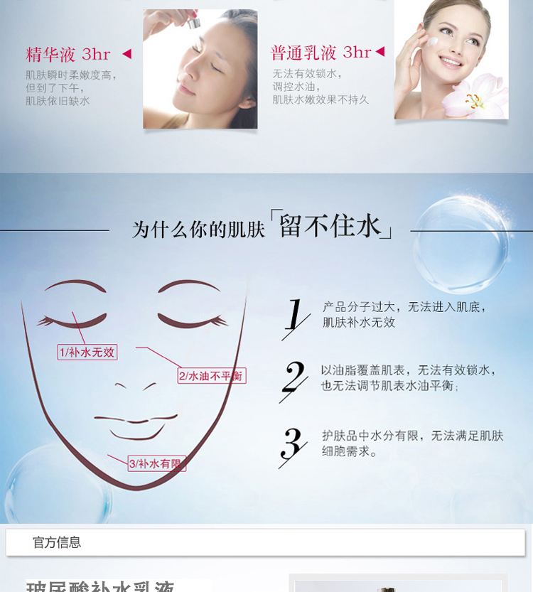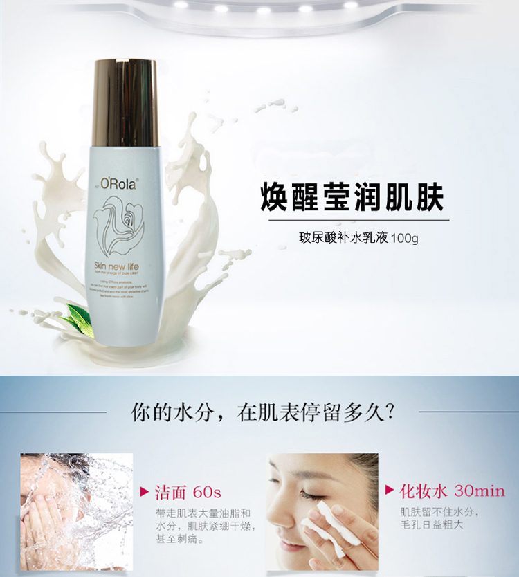 特別添加玻尿酸補水成分,時間為干涸缺水的肌膚注入水活生命力,并24小時鎖住水分。可持續強化肌膚的天然保濕屏障,注入年輕活力,幫助肌膚長時間保持自身水分。肌膚從此盡顯水潤光彩,更易抵御歲月痕跡。它將給你帶來全天候的滋潤感覺,無油膩配方,連“痘痘”皮膚也可安心使用,被稱之為“皮膚的甘露”。自然清新不油膩,能喚醒皮膚制造適量水分及改善皮膚天然滋潤保護膜,以提供給皮膚好的“保濕飲料”。