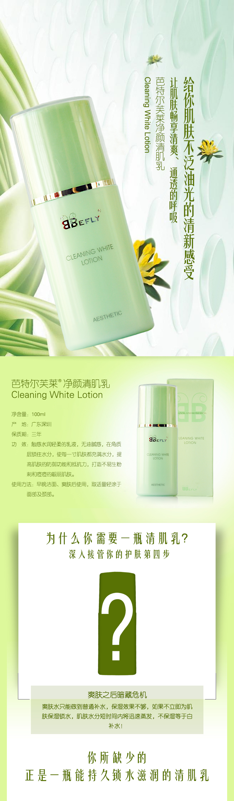 當(dāng)前位置:首頁(yè) >> 美容院產(chǎn)品 >> 芭特爾芙萊 >> 芭特爾芙萊彩妝護(hù)膚品觸感水潤(rùn)輕柔的乳液,無(wú)油膩感,在角質(zhì)層鎖住水分,使每一寸肌膚都充滿(mǎn)水分,提高肌膚的防御功能和抵抗力,打造不易生粉刺和痘痘的靚麗肌膚。